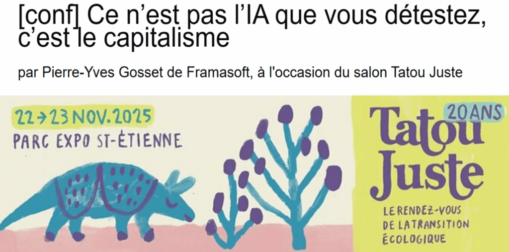Au salon Tatou Juste, Pierre-Yves Gosset (ex directeur de Framasoft, association d'éducation populaire aux enjeux du numérique et promoteur de logiciels libres), est intervenu dans une conférence sur l'IA, appréciée des - nombreux - présents pour la clarté de ses explications et la présentation des enjeux liés à l'IA. Nous joignons ci-dessous un lien vers…