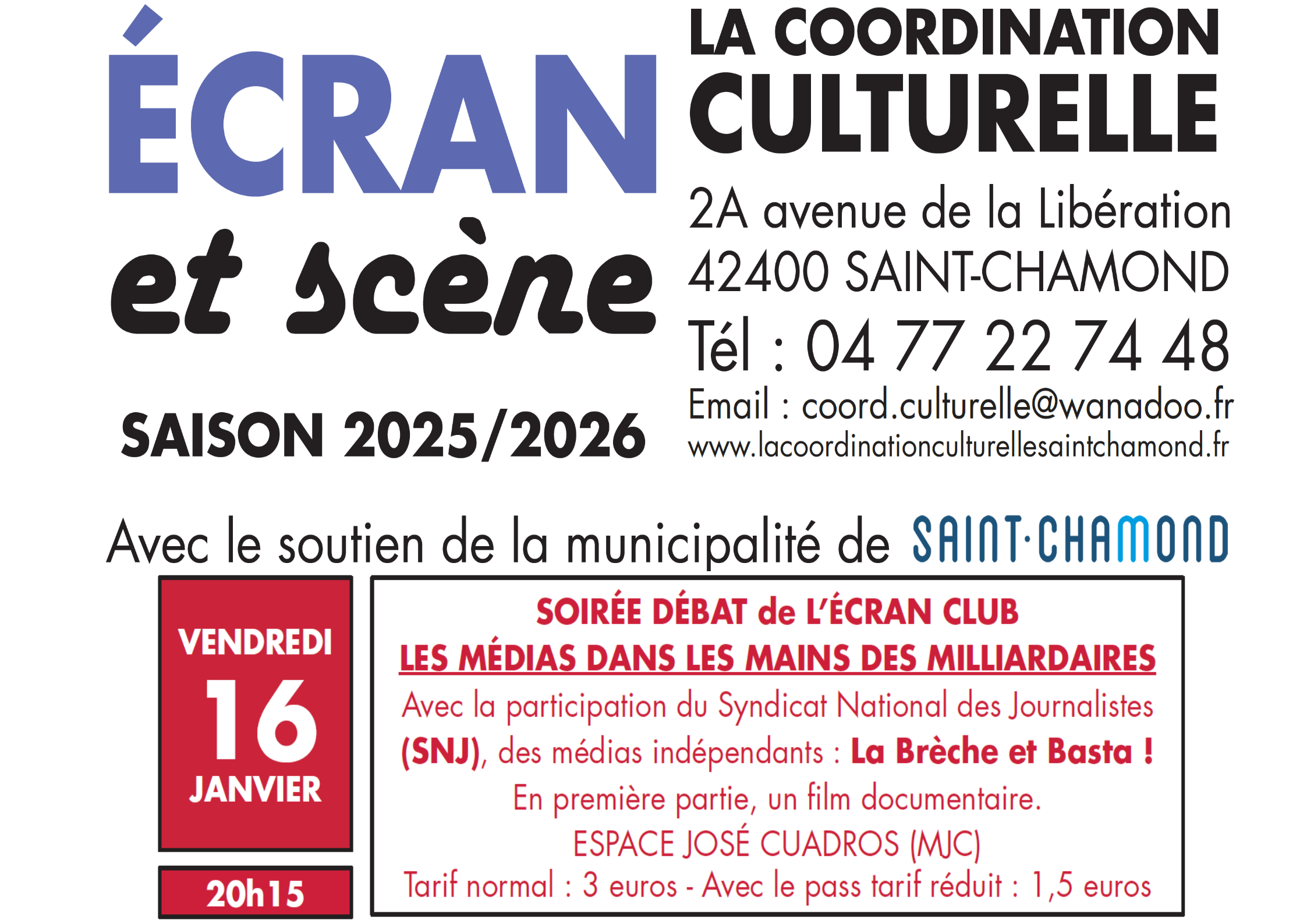 Vendredi 16 janvier à 20h15, Espace José Cuadros (MJC de Saint Chamond, 2A avenue de la Libération), Débat avec Alexandre Buisine, secrétaire général du Syndicat national des journalistes (SNJ), Clément Goutelle, rédacteur en chef du journal LA BRECHE et Sophie Chapelle, journaliste à BASTA !