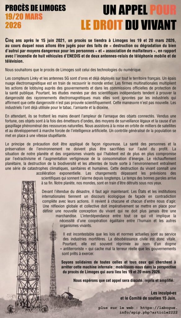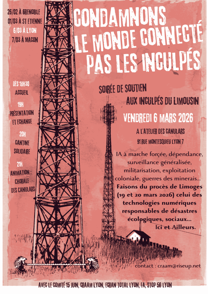 6 mars 2026 à 19h, soirée de soutien aux inculpés du Limousin, à l’atelier des Canulars, 91 rue Montesquieu, Lyon 7e , co-organisée par : Le comité de soutien 15 juin, la Coordination Régionale Anti-Armement et Militarisme, Ecran Total Lyon, Stop 5G Lyon, la FA
