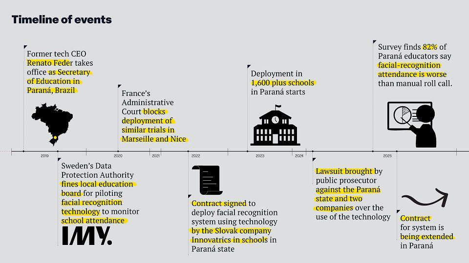 Malgré les plaintes croissantes des enseignants et l'ouverture de poursuites judiciaires, l'État du Paraná continue d'utiliser la technologie de reconnaissance faciale dans ses salles de classe. Début septembre de l'année dernière, il a prolongé son contrat d'un an , jusqu'en septembre 2026.