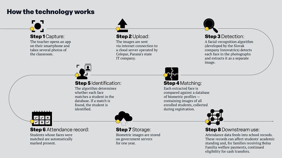 Au Colégio Estadual Professor Loureiro Fernandes, un lycée public de l'État du Paraná, dans le sud du Brésil, un cours commence comme tous les autres. Le professeur ouvre une application sur son téléphone, le lève et prend plusieurs photos de la salle. En quelques secondes, les images sont envoyées à un serveur cloud, où un algorithme de reconnaissance faciale détecte le visage de chaque élève, l'extrait et le compare à une base de données de profils biométriques. L'application LRCO Paraná renvoie une liste de noms. Les élèves identifiés sur les photos sont marqués comme présents ; ceux que le système ne trouve pas sont marqués comme absents.