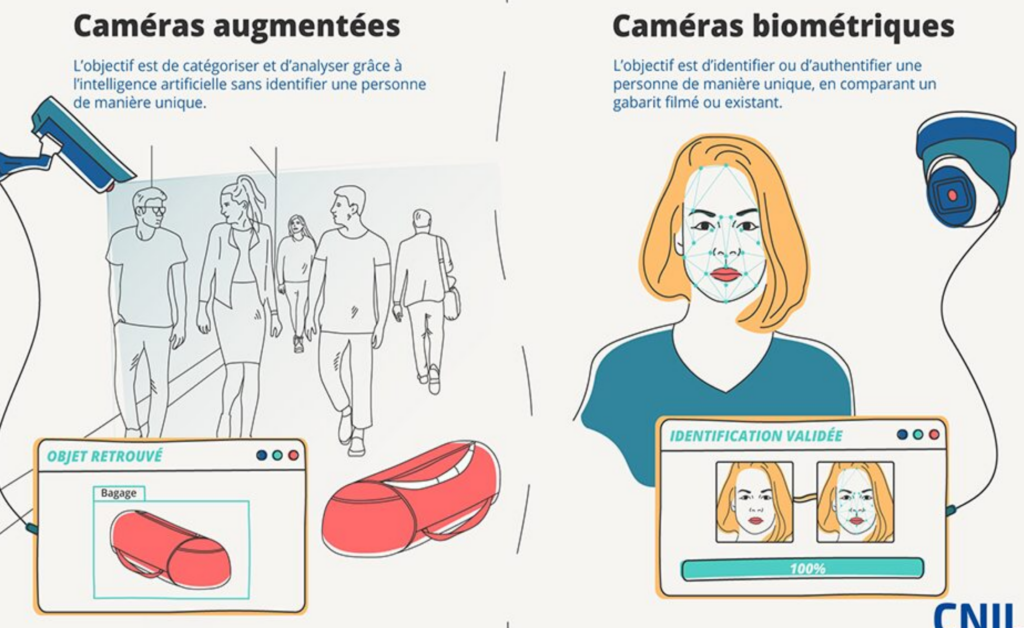 Par le schéma ci-dessous, la CNIL explique fort bien la différence, très ténue : les "caméras augmentées", relèvent de la VSA (Vidéo Surveillance Algorithmique) ; les "caméras biométriques" permettent de basculer dans la reconnaissance faciale.