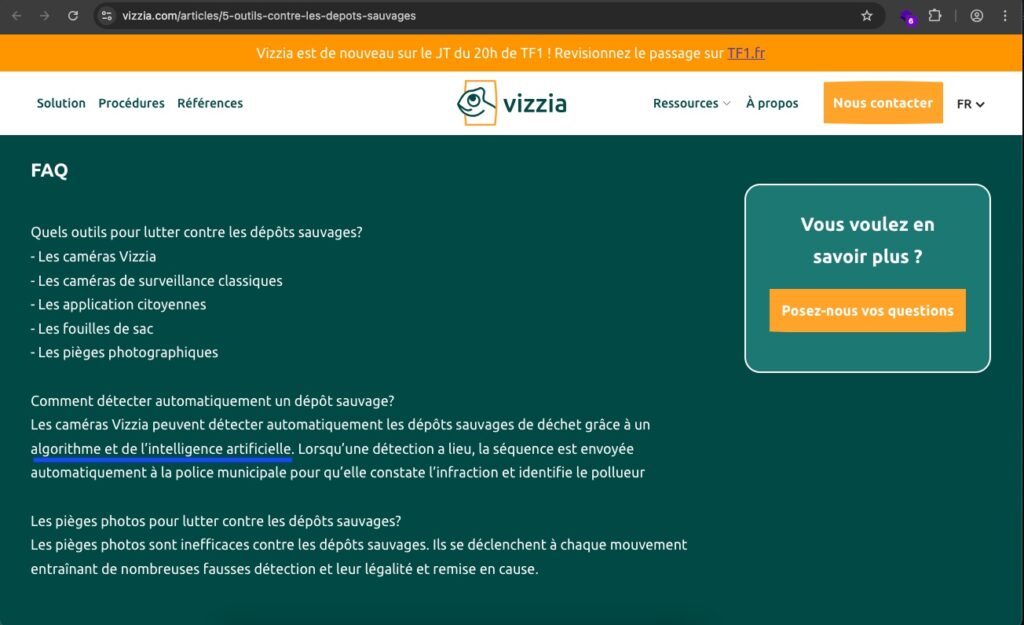 Ce risque, Vizzia semble en avoir pris conscience très récemment. La société présentait jusque là son produit sur son site comme ci-dessous : "Les caméras Vizzia peuvent détecter automatiquement les dépôts sauvages de déchets grâce à un algorithme et de l’intelligence artificielle".