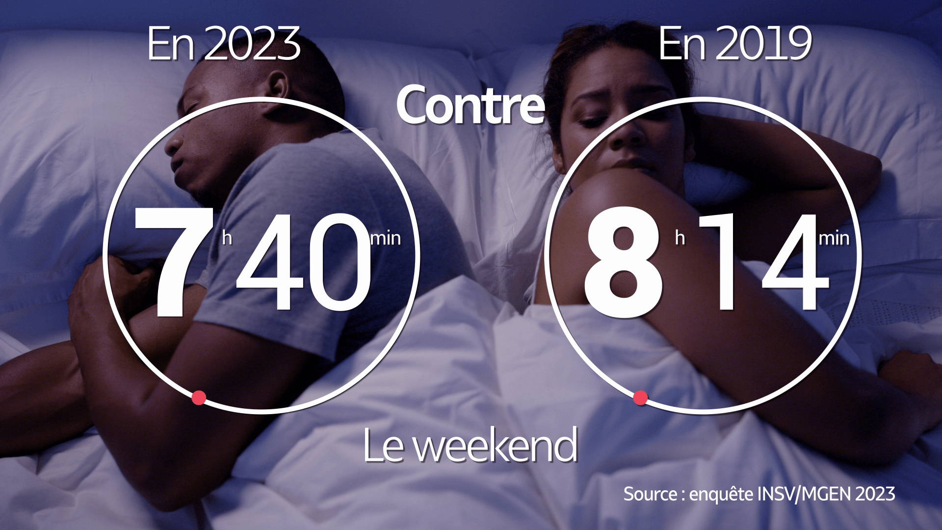 En France, rien qu’entre 2019 et 2023, on a perdu en moyenne 34 minutes de sommeil par nuit le weekend [Enquête INSV / MGEN, 2023]. Et même s’il existe quelques différences selon les pays, l’uniformité de cette tendance est frappante.