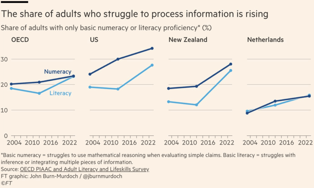 On constate déjà partout à partir des années 2010 un déclin des capacités de compréhension de l'écrit et du calcul chez les adultes.