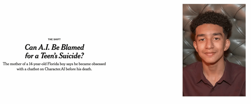 Suite au cas très médiatique (aux USA) de Sewel Setzer, un adolescent de 14 ans qui s’est suicidé en 2024 et dont la mère a porté plainte contre Character.AI (la plateforme qui avait produit un personnage virtuel dont le jeune était tombé amoureux et qui l’avait poussé au suicide), les actions légales contre les géants de l’IA se multiplient.