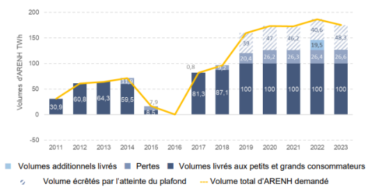 D'après Le Monde, de 2011 à 2025, l’Arenh a obligé EDF à vendre à un prix fixe environ un quart de sa production nucléaire, soit un plafond annuel de 100 térawattheures (TWh). Votée en 2010 avec les voix de la droite et du centre, la loi ayant instauré ce mécanisme visait à satisfaire les demandes de la Commission européenne pour une ouverture à la concurrence.