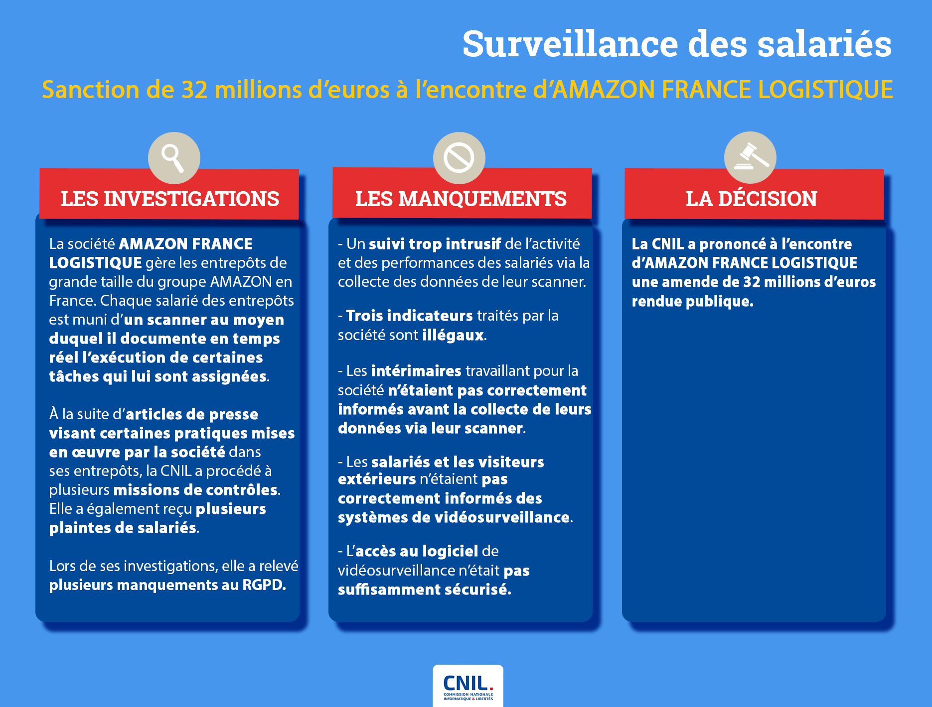 La CNIL a effectué plusieurs missions de contrôles depuis 2019 suite à des articles de presse et des plaintes signifiées par des salarié.es. A l’époque Amazon France Logistique comptait 6 200 salarié·es en CDI et faisait travailler, sur l’année, 21 582 intérimaires. Pour rendre sa décision, la CNIL se réfère au règlement général sur la protection des données (RGPD) pour infliger cette amende équivalente à environ 3 % du chiffre d’affaires, le maximum prévu étant de 4 % du CA.