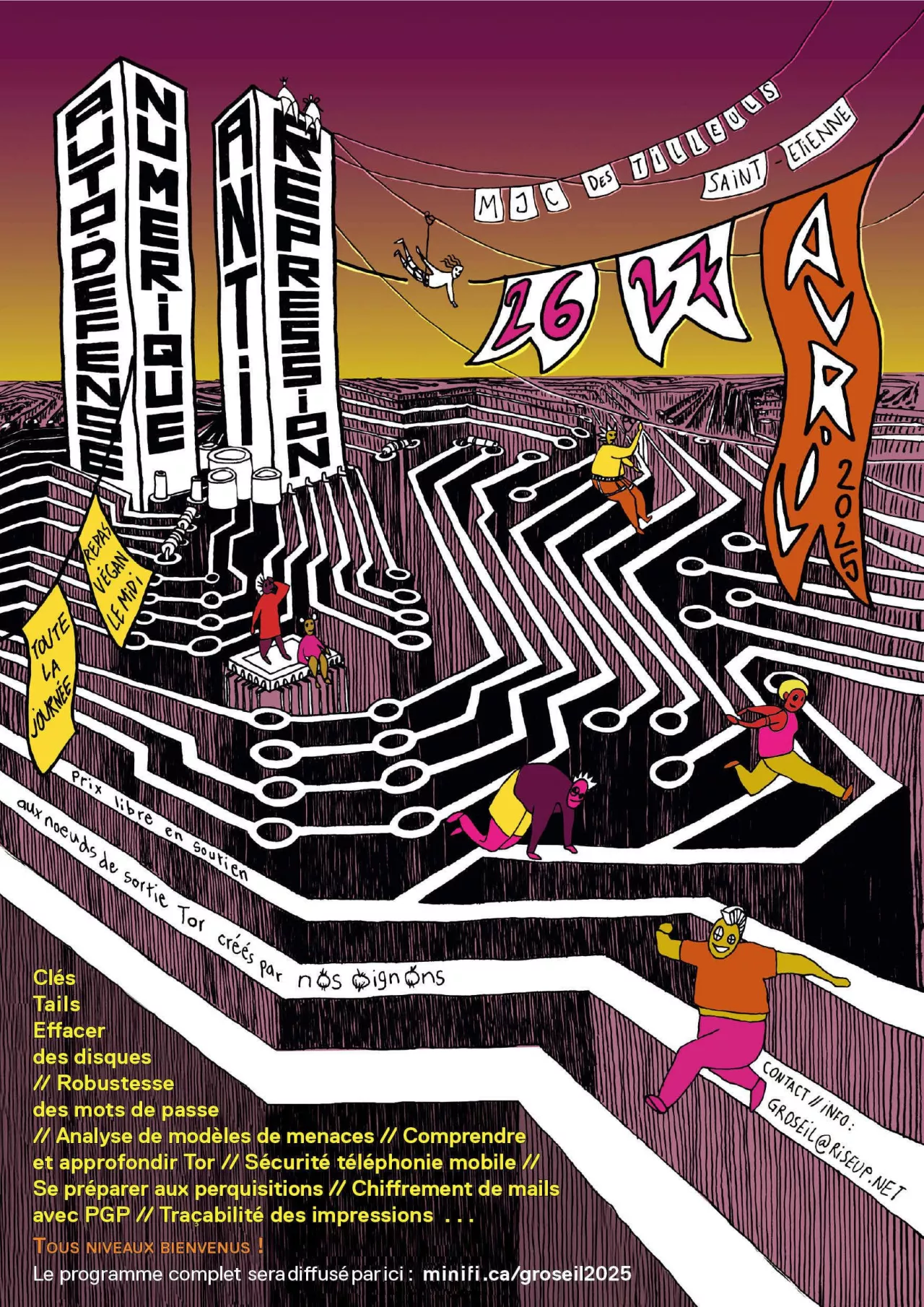 Groseil – Groupe de Recherche et d’Observation des Systèmes Electroniques et Informatiques Libres – qui intervient à Saint-Etienne les 26 et 27 avril, à la MJC des Tilleuls, 8 rue du Pavillon Chinois