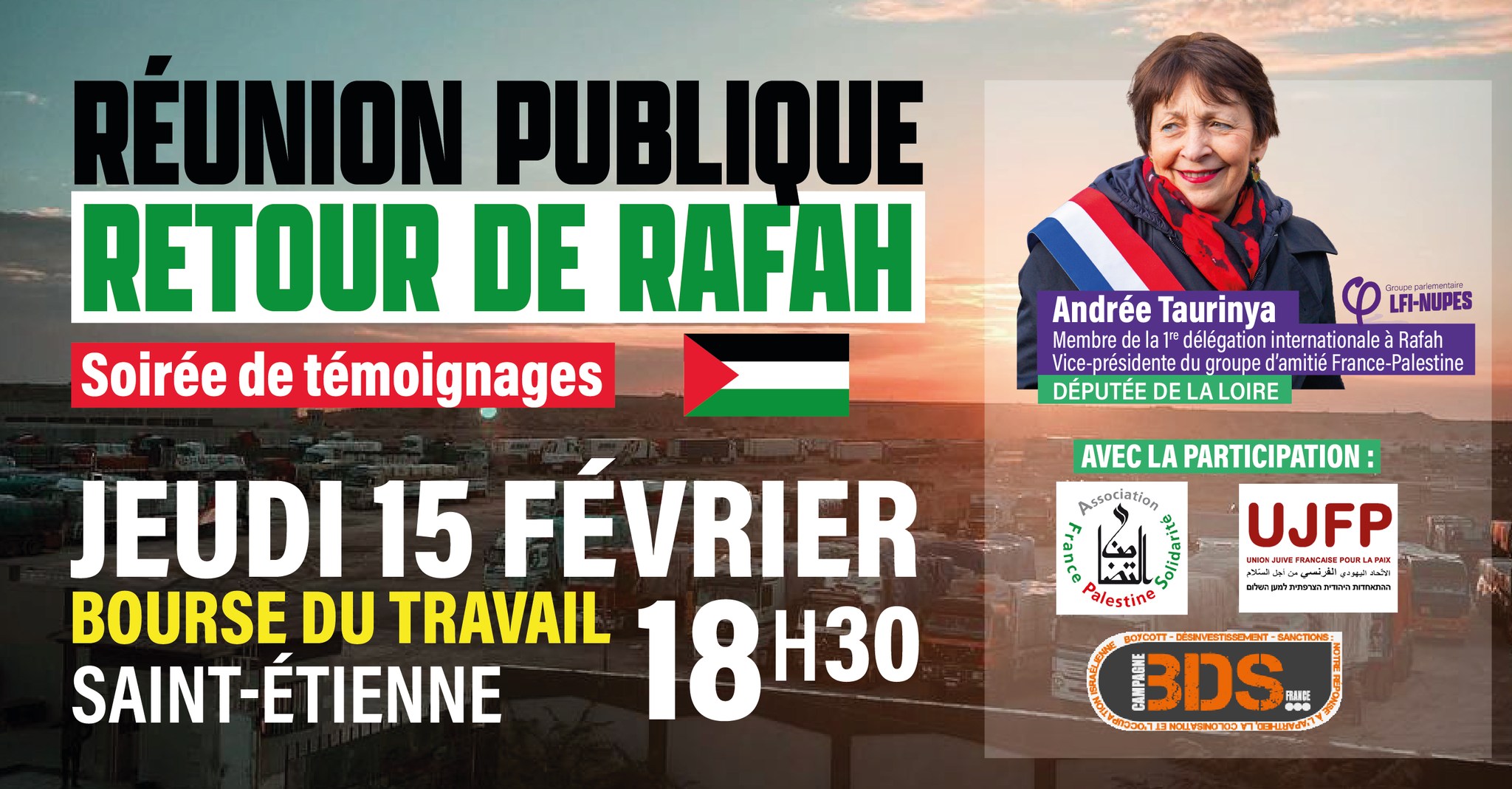 Une délégation internationale s’est rendue à Rafah, dans le territoire de Gaza. Un débat est organisé à la Bourse du Travail de Saint Etienne, le 15 février 2024 à 18h30 autour de plusieurs témoignages de la délégation, dont Andrée Taurinya, députée LFI.