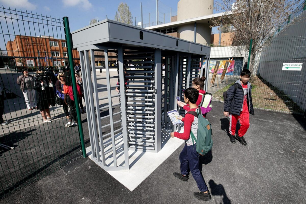 Portique de vidéosurveillance au collège Jules Romain à Nice Photo Franck Fernandes / Nice Matin, repris dans Médiapart Déjà initiateur du déploiement de la « vidéosurveillance augmentée » dans les gares et trains de la région (convention signée le 2 juin 2023, entre la région, le préfet et la SNCF), Laurent Waukiez veut profiter de l’actualité (assasinat…