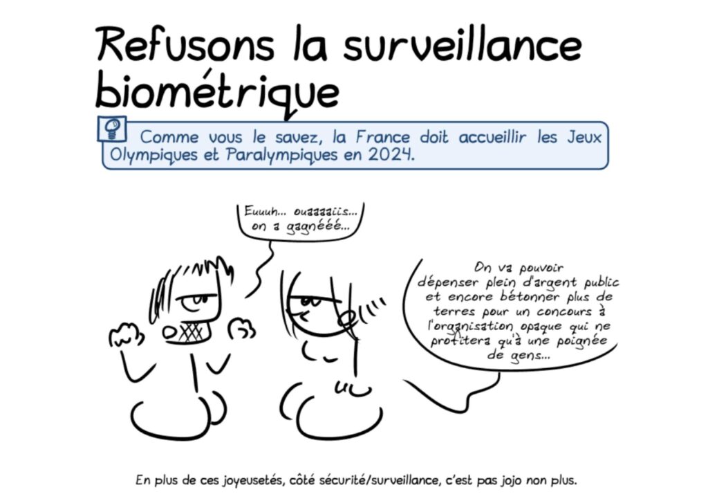 Le 6 mars 2023, ces 38 organisations (liste ci-dessous) ont fait passer la tribune jointe dans Le Monde (reproduite aussi sur le site de La Quadrature du net). Elle dénonce la volonté de la France de profiter des jeux olympiques de 2024 (en fait applicable dès cette année, et jusqu’en juin 2025 !) pour « expérimenter »…
