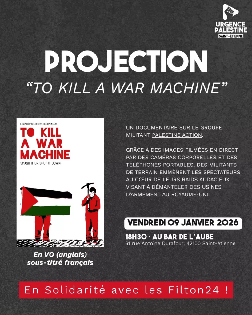 Projection vendredi 09 janvier 2026, à partir de 18h30Au Bar de l’Aube, 61 rue Antoine Durafour Au Royaume-Uni, 24 personnes sont détenues depuis un an après une action contre un site de l’entreprise d’armement israélienne Elbit à Filton, près de Bristol. Certaines sont en grève de la faim depuis 52 jours. Deux d’entre elles ont été…