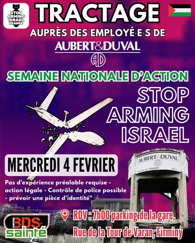 Dans le cadre de la Semaine nationale d’action Stop Arming Israël , le collectif BDS de Saint Etienne organise un tractage le mercredi 04 février à 7h (parking de la Gare, rue de la Tour d’Aran à Firminy) pour informer les employés de Aubert et Duval des envois réguliers de matériel d’armement en Israël depuis…