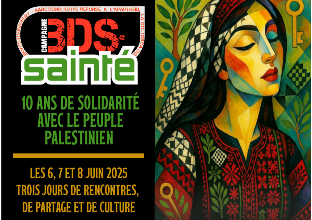 dessin de l’artiste palestinienne Reem M Arkan | @artist_reemarkan BDS organise à Saint-Etienne (Méliès Jean-Jaurès et Amicale Michelet) trois jours de tables rondes, films, lectures, ateliers, stands, musique, chants, danse, animations, activités pour enfants, hénné… Entrée et participation aux activités gratuite, paiement en liquide pour les produits vendus et la restauration Vendredi 6 Juin –…