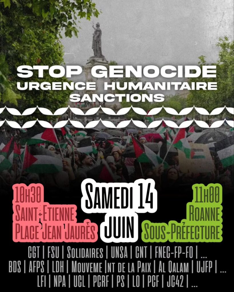 Appel inter-organisations pour Saint Etienne et Roanne Alors que Macron « dénonce » mais que des armes fabriquées en France (à Firminy !) continuent d’être livrées à Israël, de plus en plus d’organisations, de collectifs, d’individus poussent pour enfin sortir de l’inaction complice face aux meurtres en cours à Gaza. Manif à Sainté, place Jean Jaurès, le…