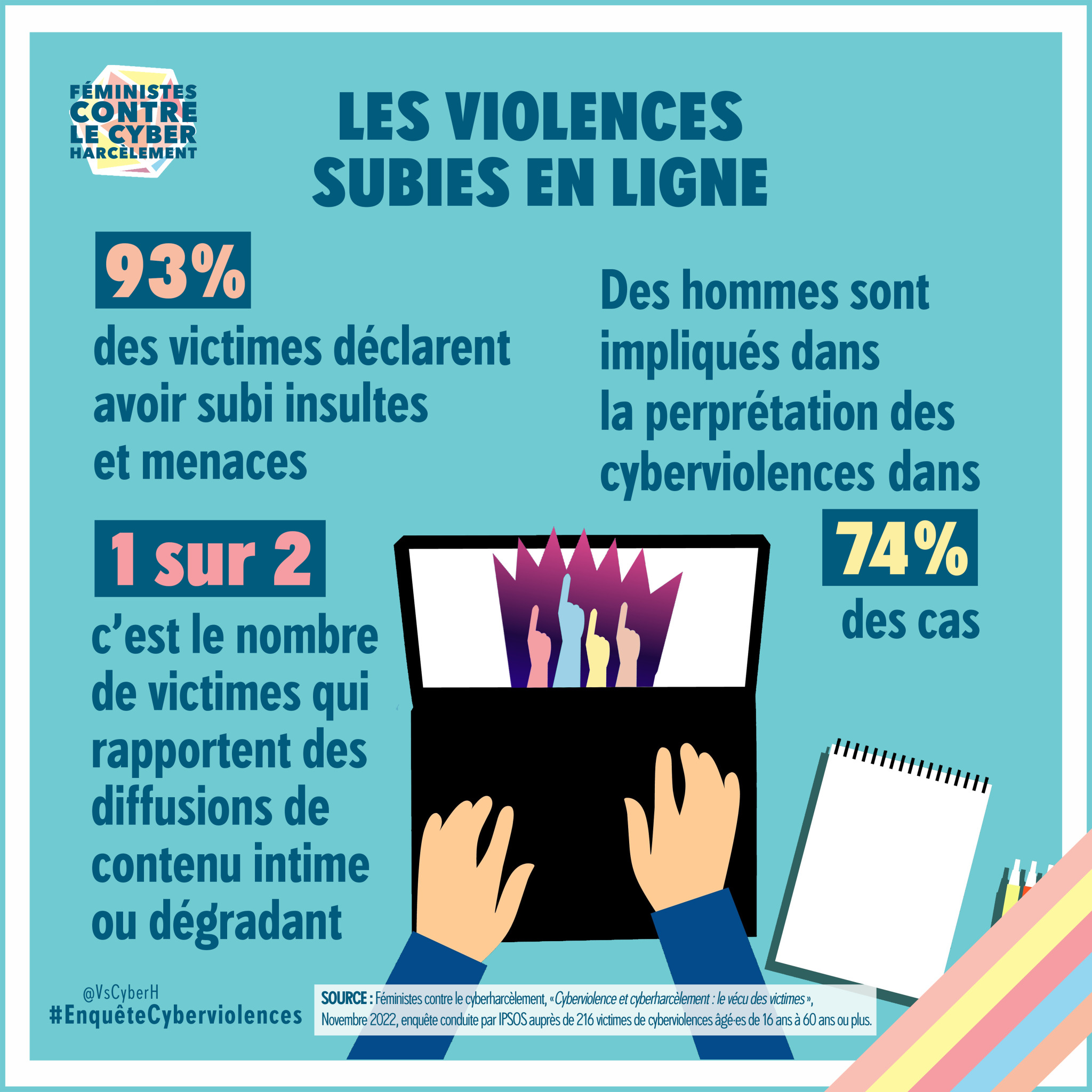 Selon une enquête IPSOS de novembre 2022 effectuée pour l’association Féministes contre le cyberharcèlement auprès de 216 victimes âgées de 16 à 60 ans, 84 % des victimes de cyberviolences sont des femmes, dont 43 % des membres de la communauté LGBTQIA+. C’est donc un phénomène massif car près de la moitié des Français·es auraient déjà été victimes de violences en ligne.