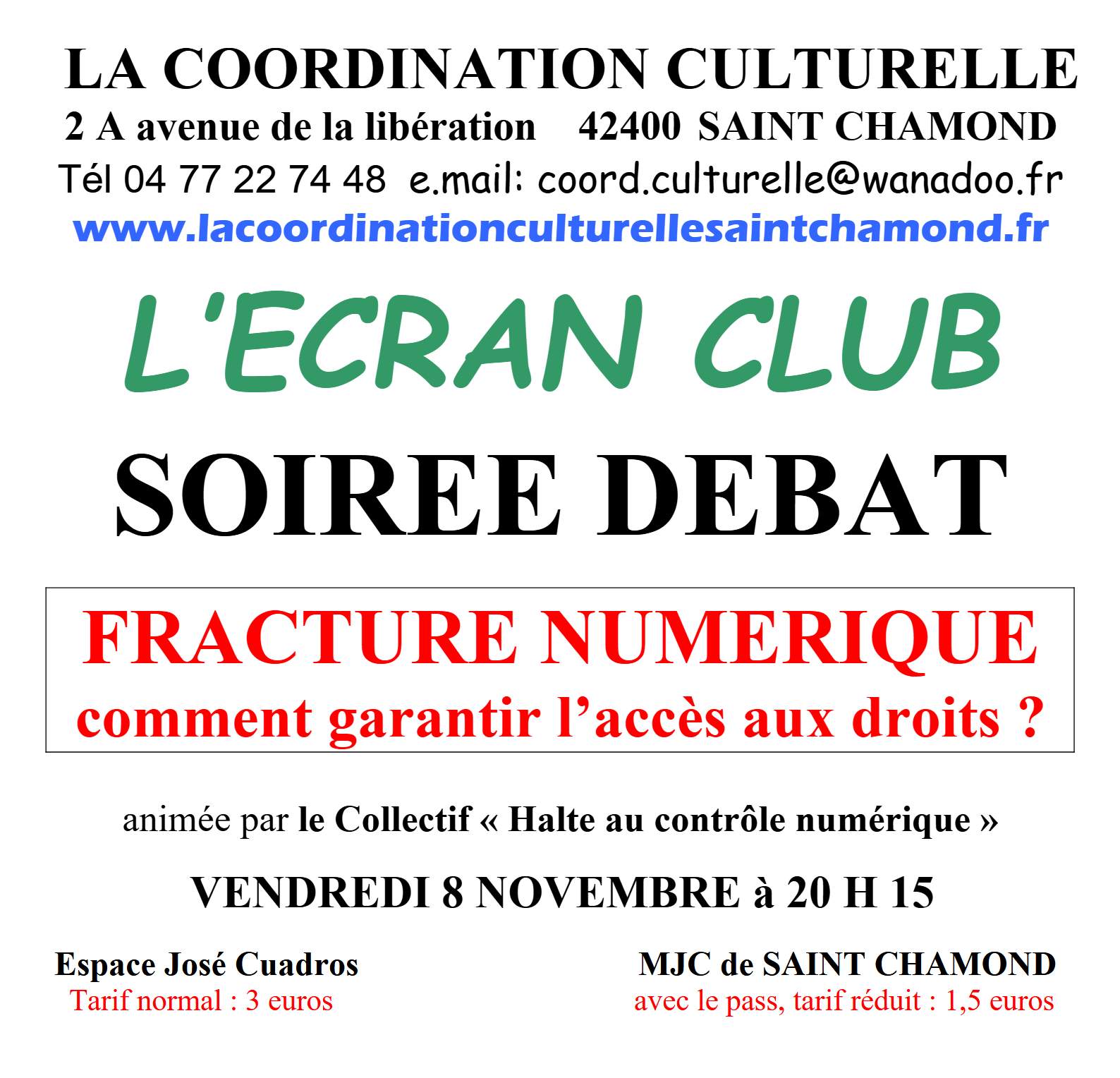 Débat organisé à la MJC de Saint Chamond, 2 avenue de la Libération, le 8 novembre à 20h15, à l’initiative de La Coordination Culturelle, animée par Halte au contrôle numérique