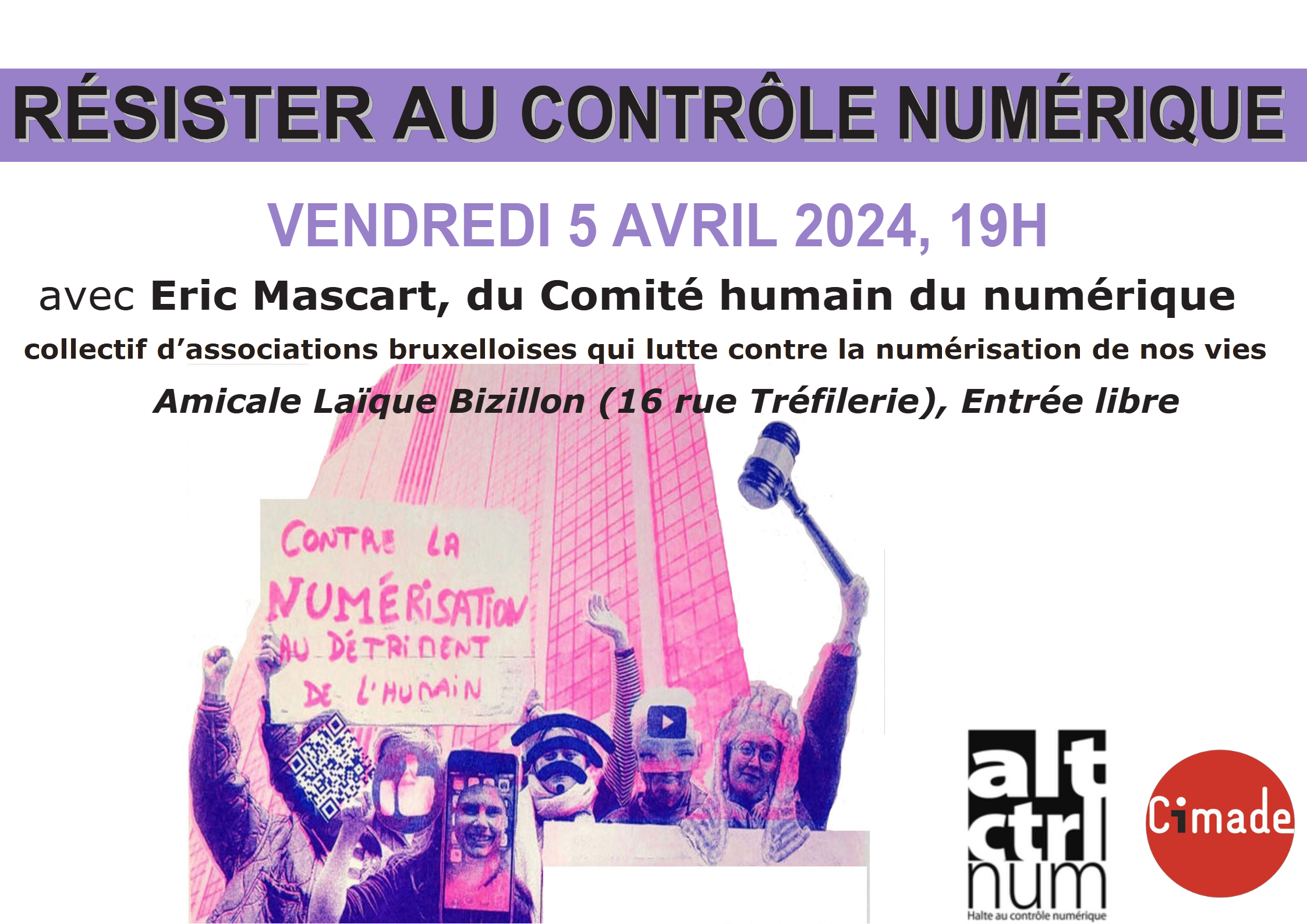 Présentation par Erick Mascart de l’expérience bruxelloise autour de l’élaboration d’un code du numérique, le vendredi 5 avril à 19h à l’Amicale Laïque de Bizillon, 16 rue Tréfilerie à Saint Etienne, organisé par Halte au contrôle numérique avec La Cimade