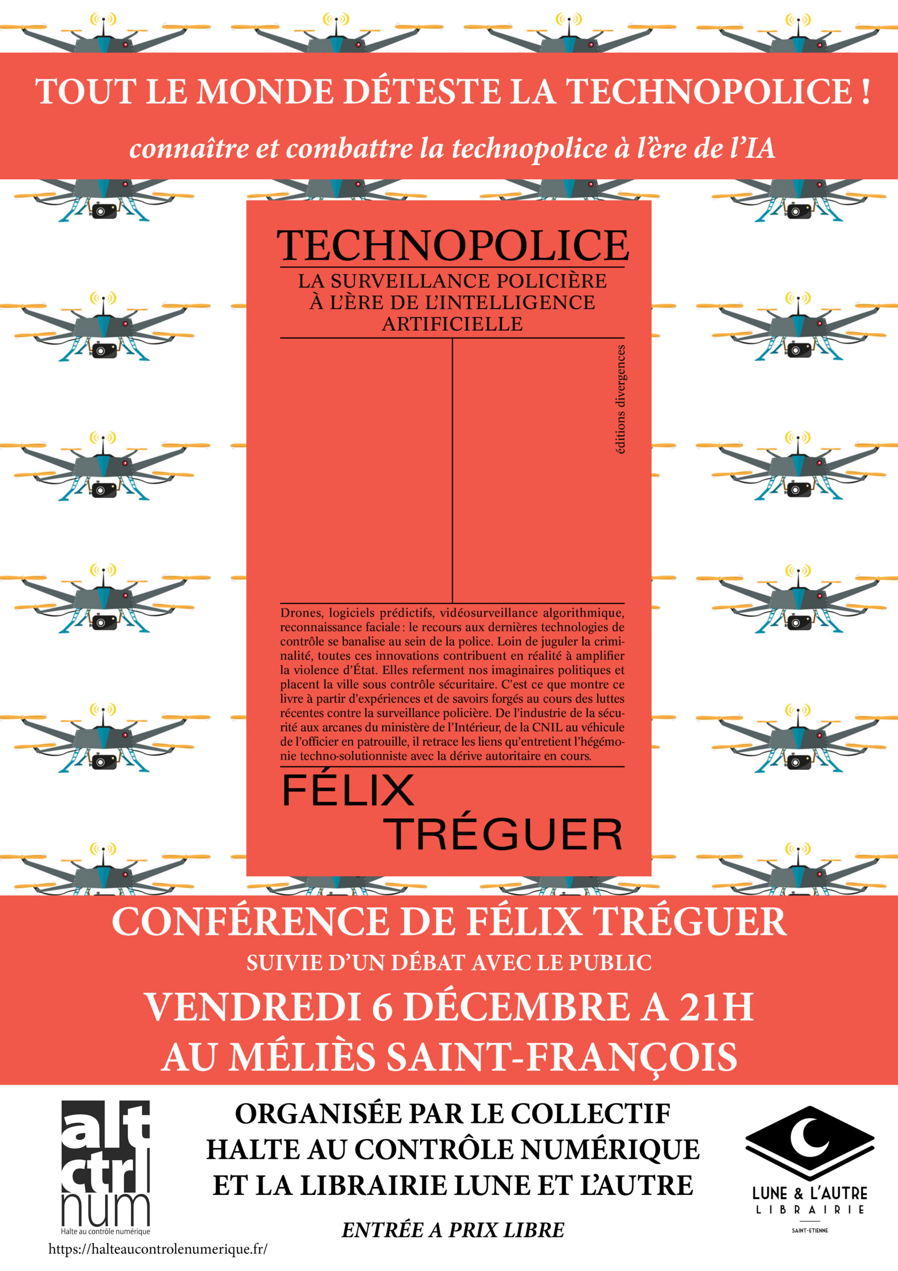 Débat organisé par Halte au contrôle numérique le 6 décembre à 21 h, au Méliès Saint François, 8 rue de la Valse, en présence de Félix Tréguer, auteur du livre « Technopolice, la surveillance policière à l’ère de l’intelligence artificielle«