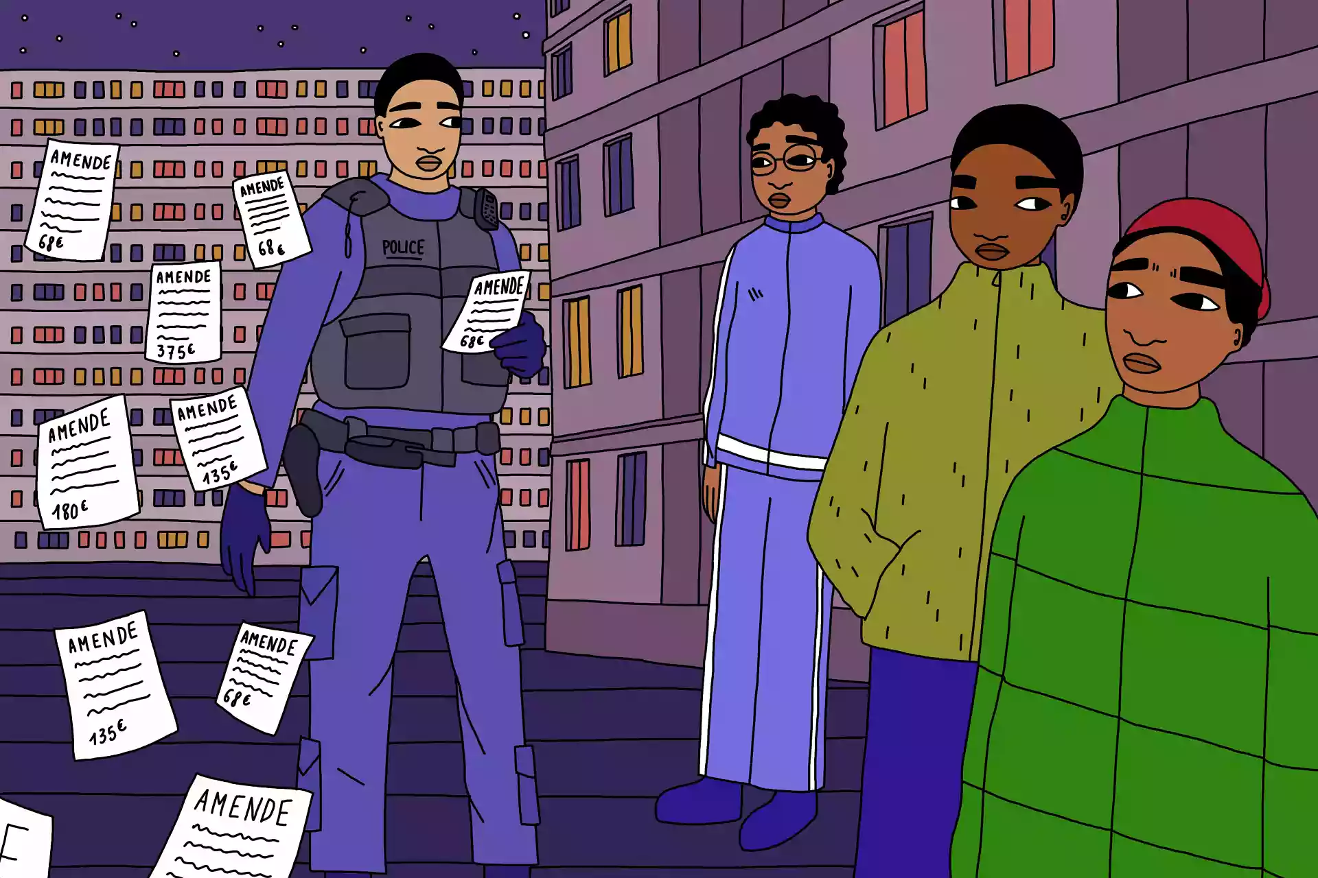 Souvent, explique-t-il, ça commence par un contrôle de police. Les forces de l’ordre relèvent son identité, et lui distribuent une amende. Le jeune homme se souvient qu’une fois, alors qu’il était assis dehors avec ses amis, la police est venue leur demander de nettoyer les alentours, « comme ça, ils nous mettraient pas d’amende ». Les jeunes s’exécutent. « À la fin, on s’est quand même pris une amende. » Il soupire : « Franchement, j’ai trop de problèmes avec eux. Ils m’ont déjà frappé, ils m’ont insulté, ils m’ont embarqué pour rien… Je vais pas vous mentir, ils fatiguent ici. »