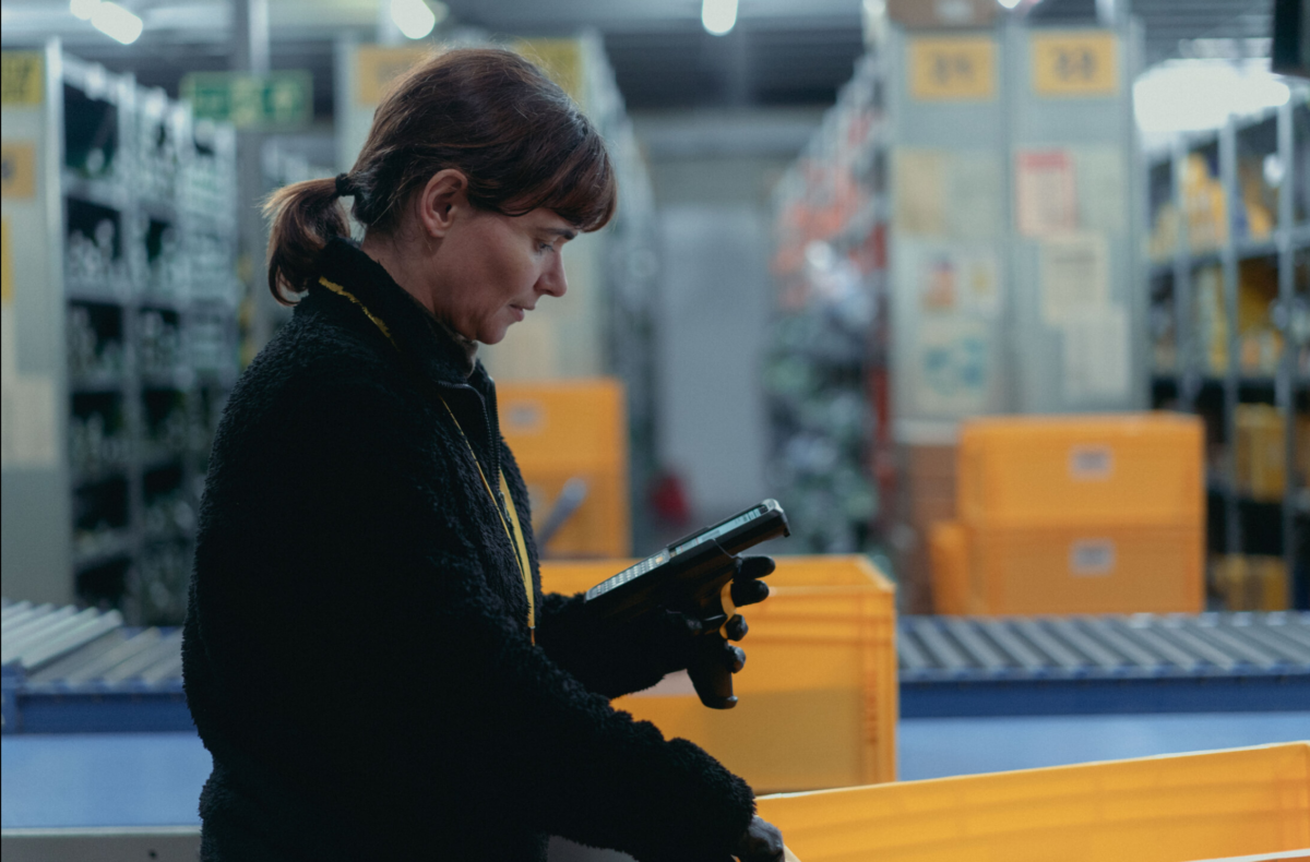 Photo du film « On Falling« , de Laura Carreira, et du dialogue contraint de l’actrice avec son scanner de codes-barres