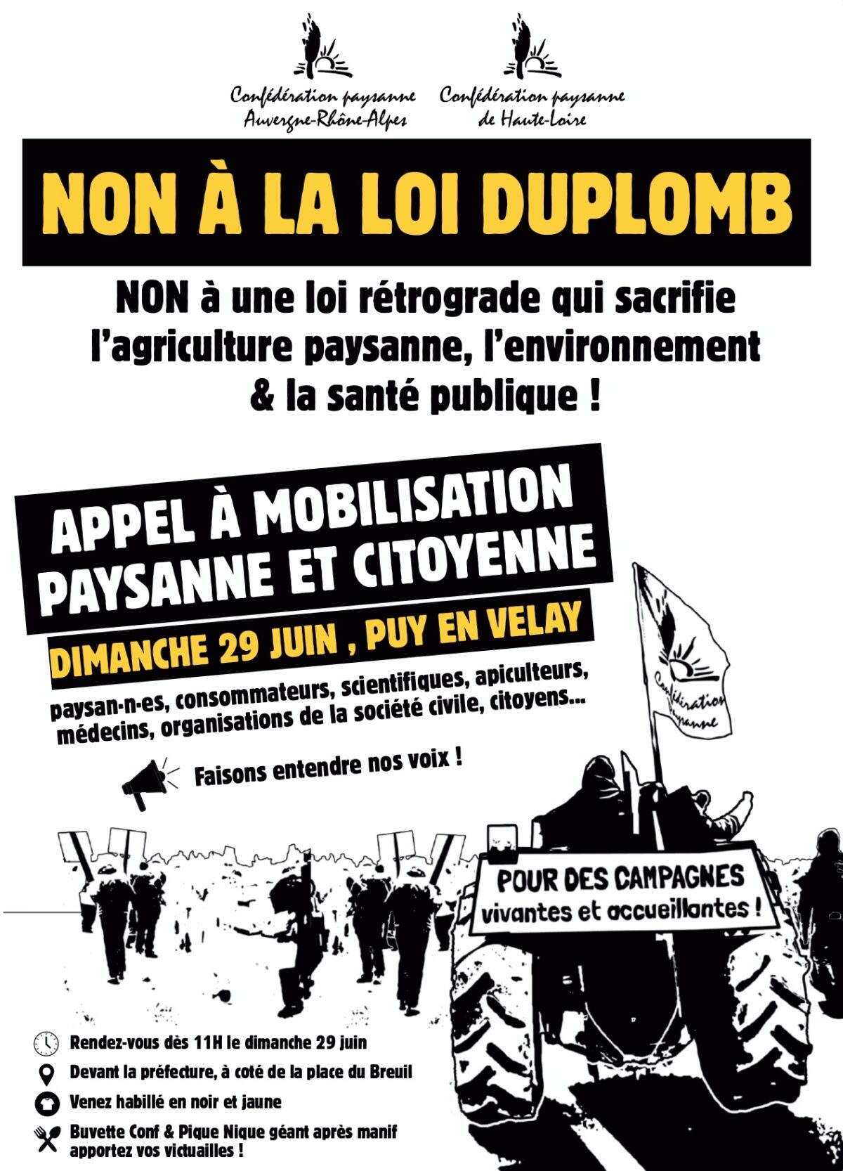 Rassemblement le dimanche 29 juin 2025 à 11h devant la Préfecture de Haute-Loire au Puy en Velay, à l’appel de la Confédération paysanne Auvergne-Rhône-Alpes et d’autres organisations (France Nature Environnement, CGT 43…), puis marche jusqu’à la permanence de L. Duplomb