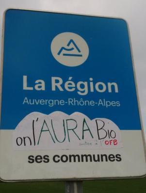 Appel à mobilisation citoyenne pour soutenir l’OFB (Office francais de la biodiversite) suite au courrier incendiaire adressé par les responsables actuels de la région Auvergne-Rhône-Alpes à l’ensemble des agriculteurs. Transformons les panneaux bleus dédiés à la promotion de la région (et de son ex-président Laurent Wauquiez) en panneaux d’expression citoyenne au service de la collectivité, en inscrivant le message « on l’AURA Bio OFB« . Chacun peut agir dans sa commune.