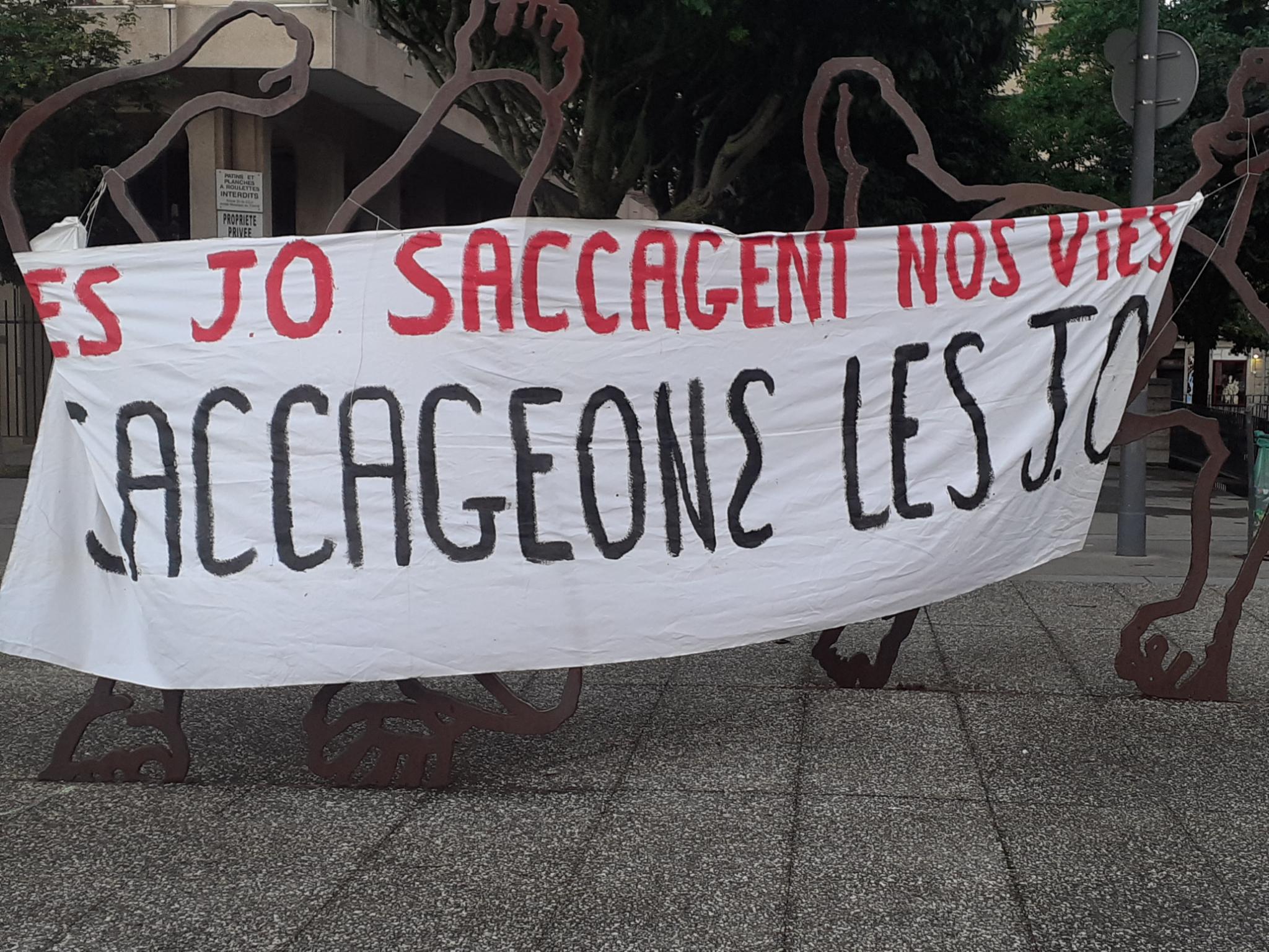 Le 21 juin, jour de la fête de la musique, nous avons participé à la manifestation place Chavanelle contre les saccages des JO2024 et la VSA. Une action qui a tourné court à cause du comité d’accueil, mais qui a tout de même fait du bruit.
