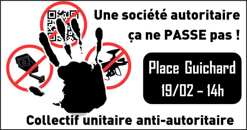 Un collectif unitaire anti-autoritaire, réunissant plusieurs collectifs lyonnais, a lancé un appel contre le passe et l’état sécuritaire le 19 février 2022 à 14h Place Guichard à Lyon. Parmi les premiers signataires on trouve : l’Assemblée en lutte contre le passe sanitaire & vaccinal Lyon/Oullins, le CNNR LYON, Occupons69, l’Assemblée Gilets Jaunes Lyon & Environs,…