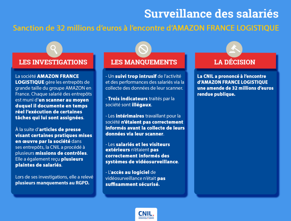 Le 27 décembre 2023, Amazon a été condamné à une amende de 32 millions d’€ par la Commission nationale de l’informatique et des libertés (CNIL, communiqué du 23 janvier) « pour avoir mis en place un système de surveillance de l’activité et des performances des salariés excessivement intrusif« . La sanction concerne aussi « la vidéosurveillance sans information et insuffisamment sécurisée« . En la matière,…