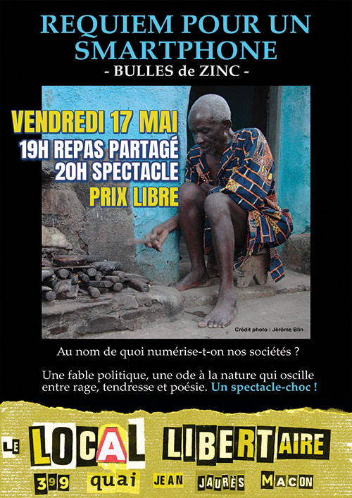 Spectacle proposé par la Compagnie Bulles de Zinc au Local libertaire, 399 quai Jean Jaurès, Macon à 20 h L’objet du délit ? Un smartphone, celui d’Amina, autour duquel gravitent trois personnages. Chacun va délivrer son récit de vie, qui le lie à cet objet : depuis l’esclavage dans les mines du Congo jusqu’à l’amour…