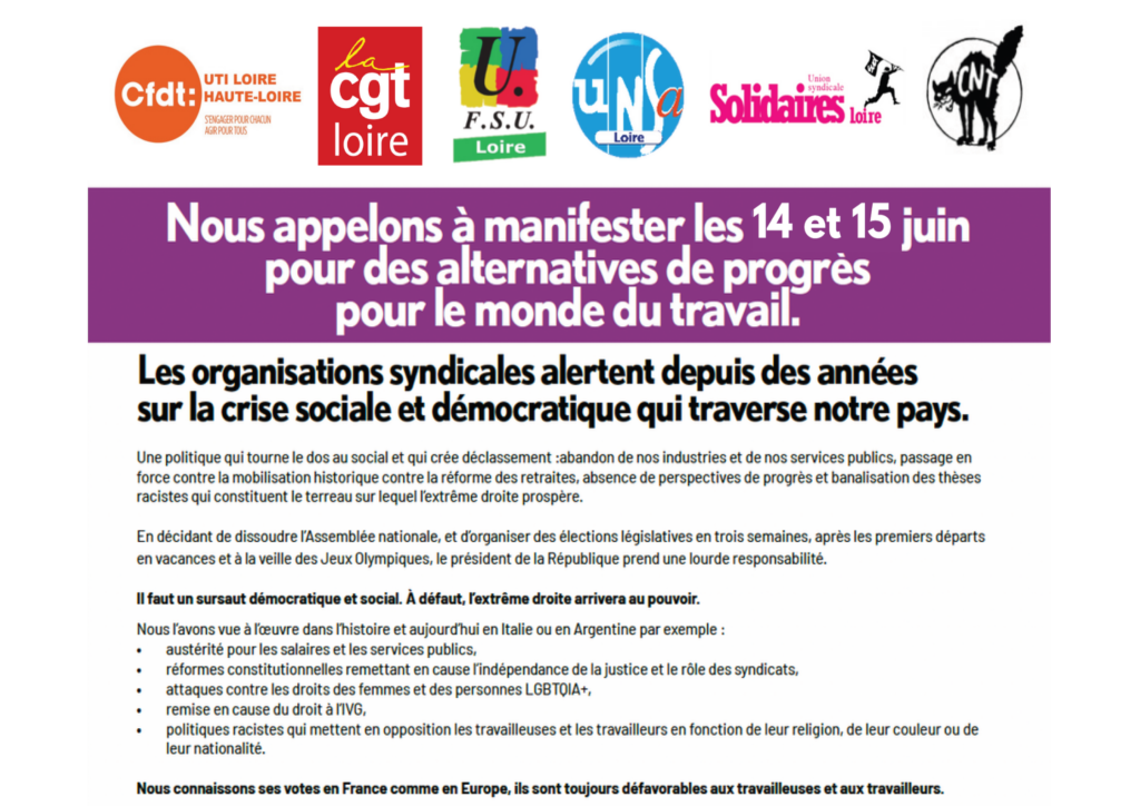 A l’appel des CFDT, CGT, FSU, UNSA, Solidaires, CNT, FO Contre l’extrême droite et le néo-libéralisme Pour la démocratie et le progrès social et environnemental Manifestation St Etienne, jeudi 20 juin – 19 h Parc Joseph Sanguedolce, jusqu’à Hôtel de ville