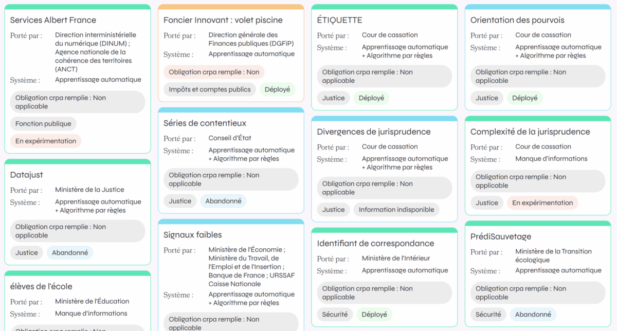 L’Observatoire des algorithmes publics (Odap) cherche à inventorier l’ensemble des algorithmes et systèmes d’intelligence artificielle (IA) utilisés par les administrations françaises (il y en aurait environ 140, 120 sont actuellement analysés par l’ODAP), pour les rendre plus transparents et contribuer à leur évaluation indépendante.